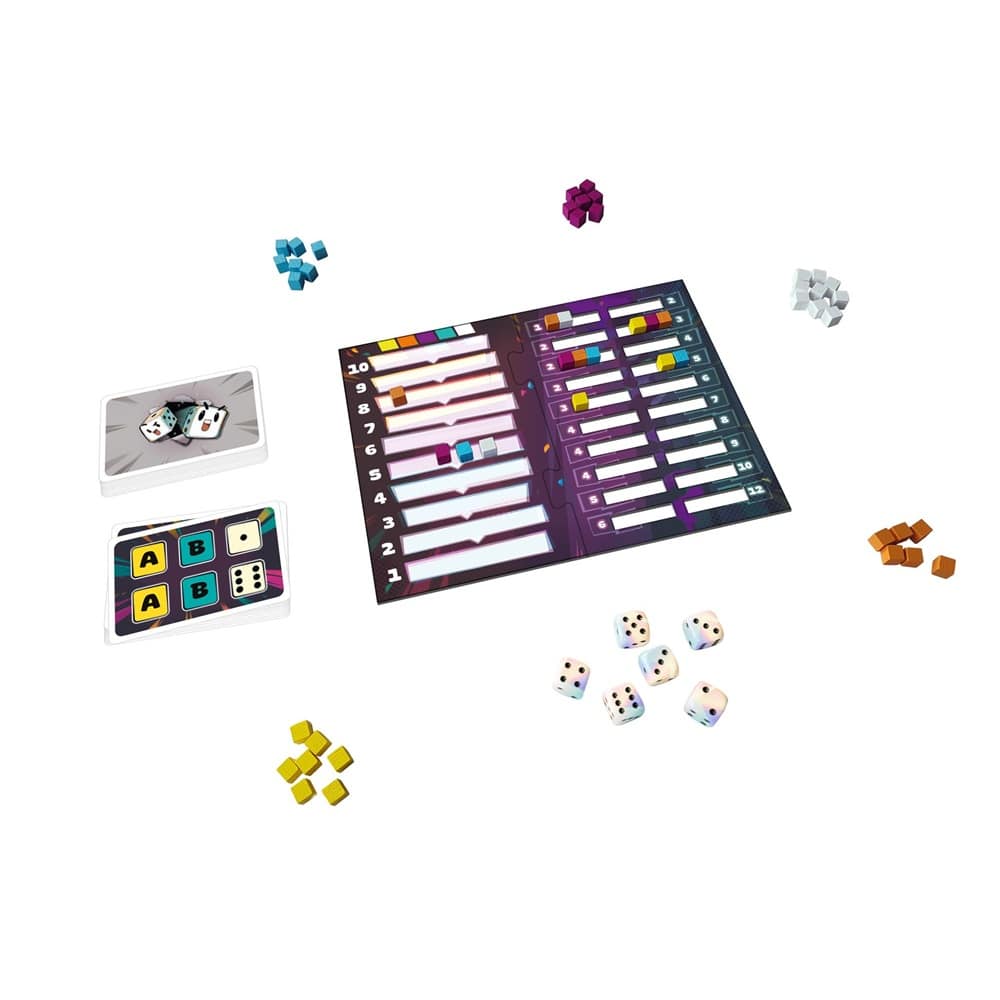 Inhalt: 55 Karten, 55 Spielsteine, 6 Würfel, Tableau, Übersicht, Spielanleitung.