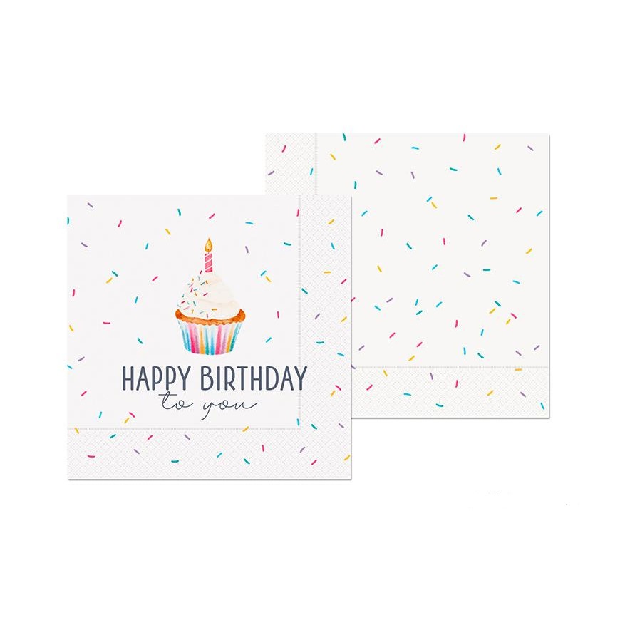 20 Servietten mit dem Spruch "Happy Birthday to you". Die Servietten sind 3 lagig und ca. 16,5 x 16,5 cm bzw geöffnet 33 x 33 cm groß.