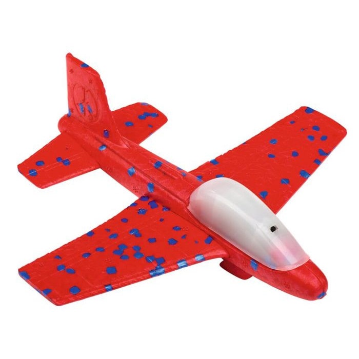 Kleiner Leuchtflieger aus Styropor. Das Flugzeug ist ca. 17 cm groß. Einfach die Styropor-Teile auspacken, das Flugzeug zusammenstecken, werfen und schon gleitet das Flugzeug durch die Luft. Ein besonderes Highlight: Das Cockpit des kleinen Flugzeugs ist mit bunten LED-Lichtern ausgestattet, die den Flieger dank des simplen Ein- und Ausschalters jederzeit beleuchten können.