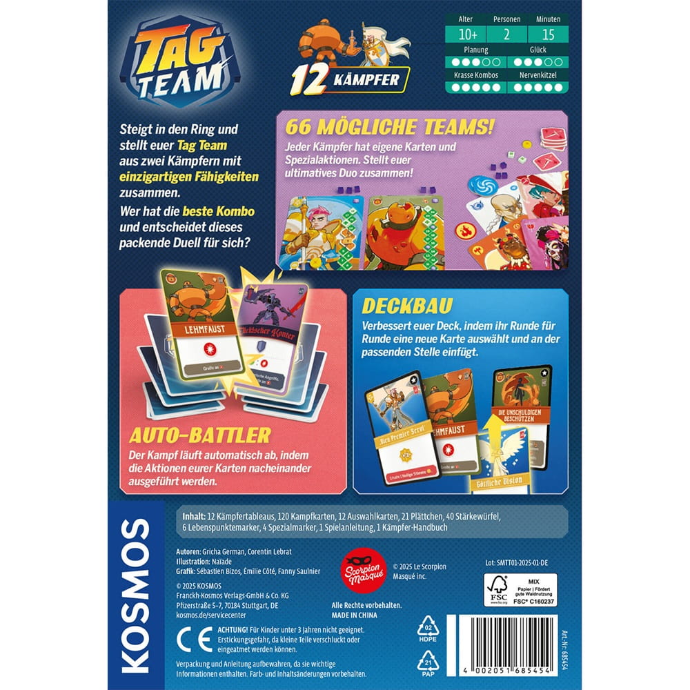 Auf in den Ring: Welches Tag Team gewinnt das Duell? Im spannenden 2er-Deckbau-Spiel stellen sich die beiden Spieler je ein Team aus zwei Kämpfern mit unterschiedlichen Fähigkeiten zusammen. Mit deren kombinierten Kartendecks treten sie Runde für Runde gegeneinander an, indem immer die oberste Karte aufgedeckt und die Effekte ausgelöst werden. Der Autobattler mit spannendem Twist: In jeder Runde wird dem Deck gezielt eine neue Karte hinzugefügt – ohne die Reihenfolge der Karten zu durchmischen! Welche Karten treten jetzt gegeneinander an? Wo sollten die eigenen neuen Karten taktisch klug eingebaut werden? Und an welcher Stelle wird man von neuen gegnerischen Aktionen überrascht? Das eigene Deck optimieren, die Karten des Gegenübers einschätzen und Angriffe möglichst gekonnt blockieren: ein Action-geladenes Taktik-Duell ab zehn Jahren mit überraschenden Wendungen, einfachen Regeln und großem Wiederspielreiz durch zwölf individuelle Charaktere!